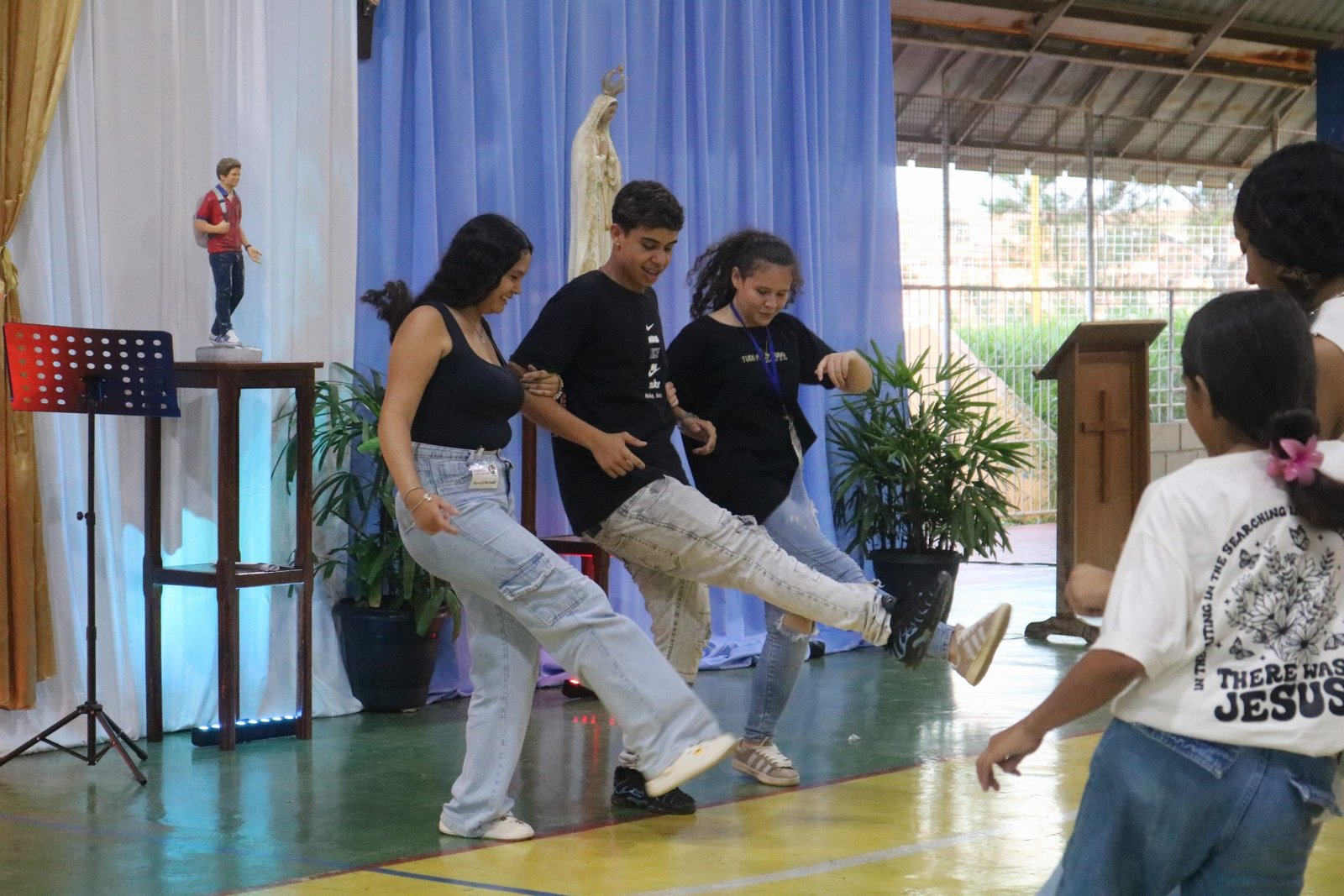 As dinâmicas propostas foram fortes e simbólicas. Em uma delas, refletiu-se sobre como o mundo tenta afastar o ser humano do caminho de Deus; porém, ao ouvir o chamado do Senhor que nos chama pelo nome, é possível enfrentar os desafios e permanecer firmes com Ele.